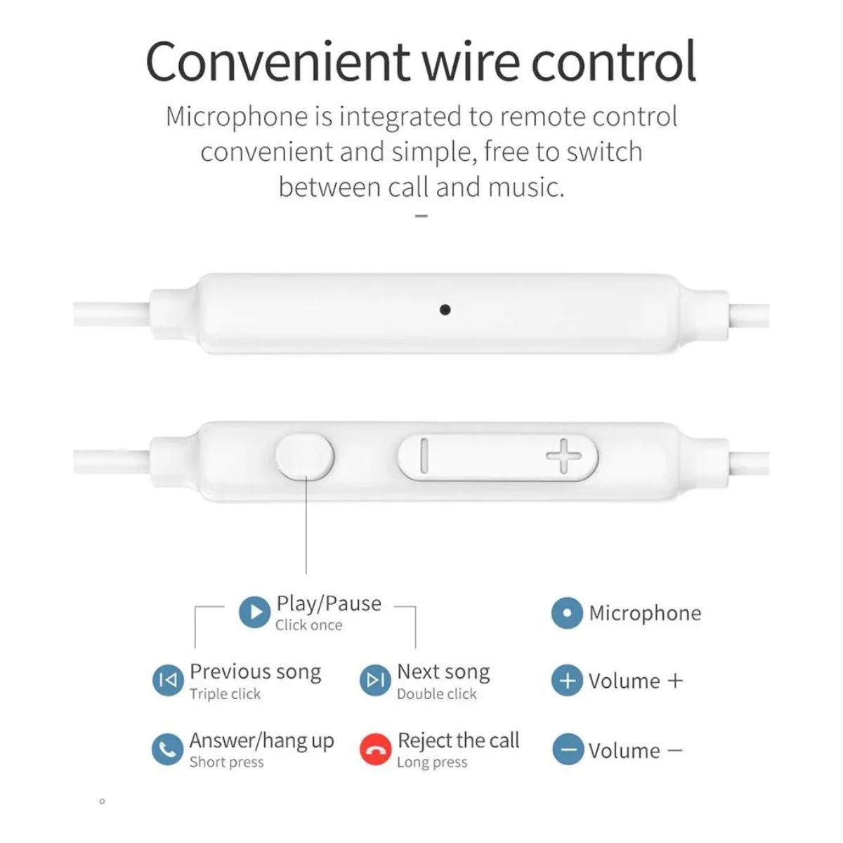 – Control remoto: botón único funcional, botón de ajuste de volumen, auriculares adaptados para controlar.