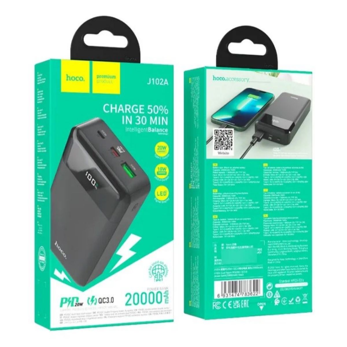 La J102A Figura Genial es una batería externa portátil de alta capacidad con 20 000 mAh, ideal para mantener cargados tus dispositivos en cualquier lugar. Gracias a su compatibilidad con protocolos de carga rápida PD3.0, QC3.0, FCP, AFC y más, asegura una recarga eficiente y estable en smartphones, tablets y otros dispositivos electrónicos.