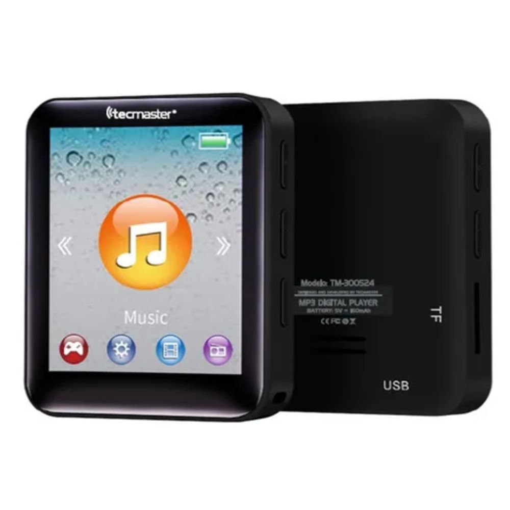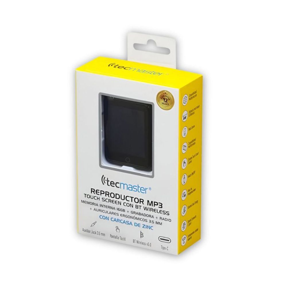 TECMASTER MP3 TOUCH SCREEN BLUETOOTH 16GB, CARCASA METAL + AUDÍFONO ERGONÓMICO JACK 3.5 MM, NEGRO